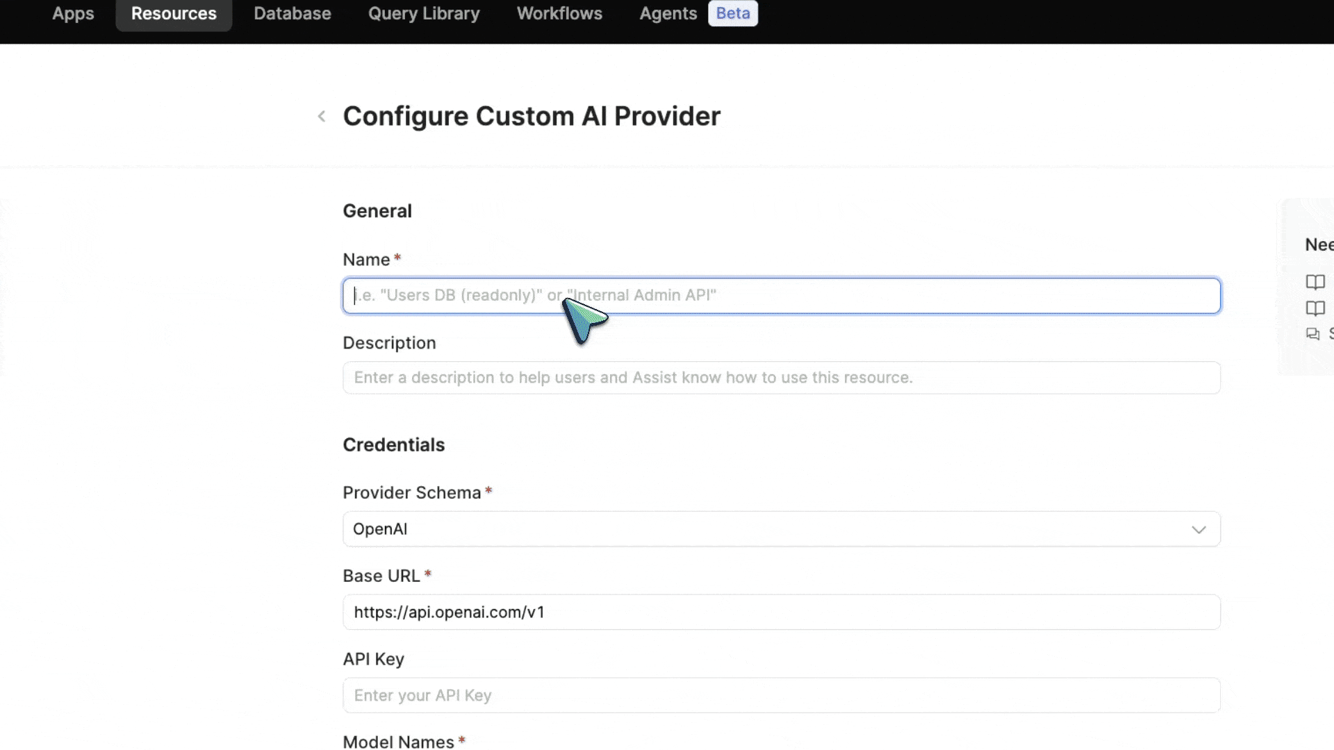 Inside your Retool dashboard, configure LiteLLM as a custom AI resource: